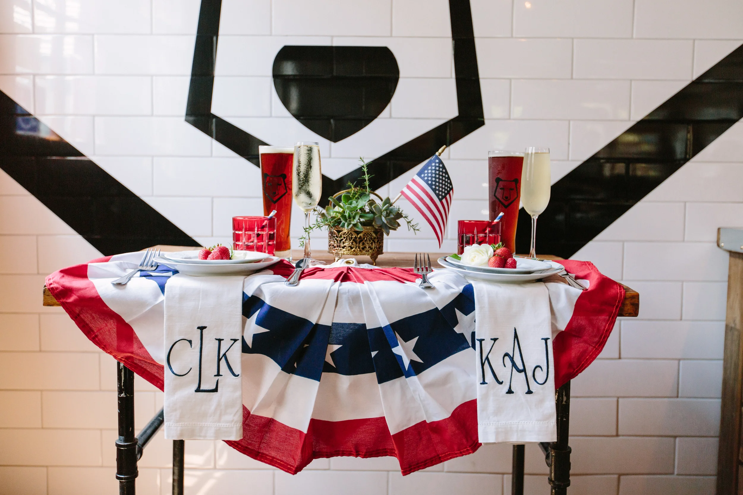 Recently Sophie of the Planners Fete asked us to do a table design for the Brass Bear Brewing event and since Fourth of July was just around the corner, we jumped at the chance to dust off all of our red, white and blue décor! We used our Ralph Lauren plaid plates, our red cut glassware from Pottery Barn and vintage lace plates we collected over the years. We also styled an invitation suite designed by the talented Tracy of Lazaro Press and got to use some of the stamps from our vintage stamp collection.